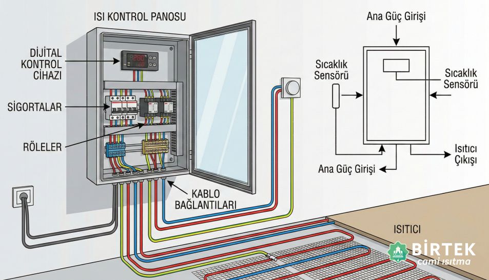 Birtek Cami Isıtma olarak, cami ısıtma sistemlerinin kalbi sayılan kontrol panolarının montajını, sadece bir "montaj işlemi" olarak değil, bir mühendislik hizmeti olarak ele alıyoruz. En kaliteli ısıtma filmleri ve en akıllı panolar dahi, doğru bir elektrik altyapısı ve profesyonel kurulumla desteklenmediği sürece tam performans gösteremez. Bu bilinçle, caminizin elektrik yükünü hesaplıyor ve sistemi yangın riskine karşı sıfır tolerans ilkesiyle devreye alıyoruz.